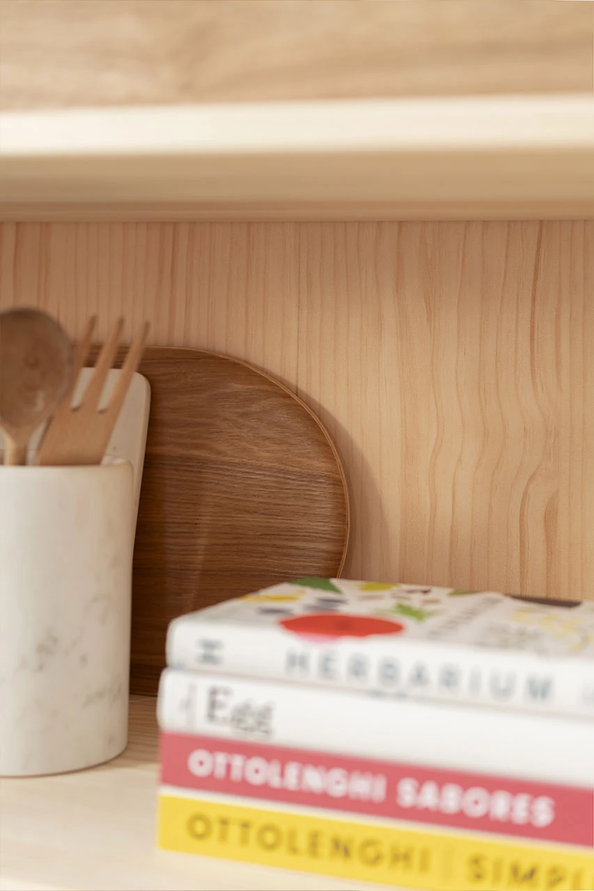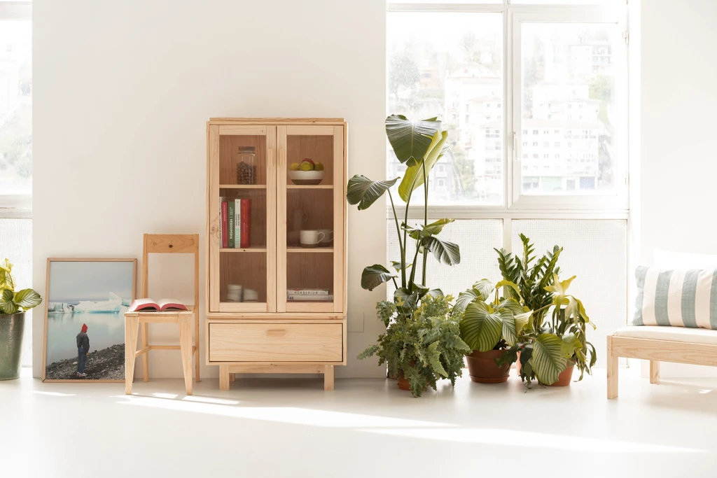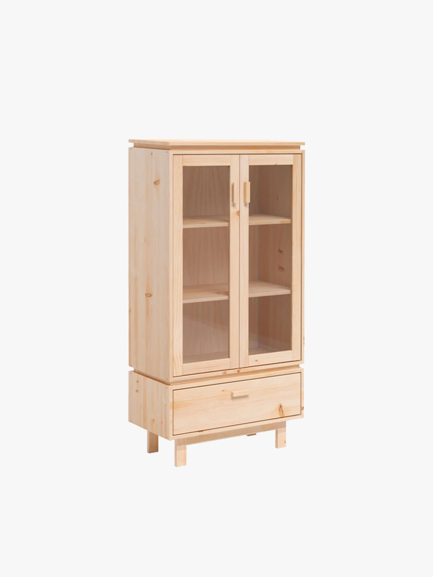 Vitrina de madera maciza y natural. Un mueble de diseño con gran capacidad de almacenaje. Con un cajón con rieles integrados y dos puertas acristaladas, para decorar la sala de estar o como despensa en la cocina.
