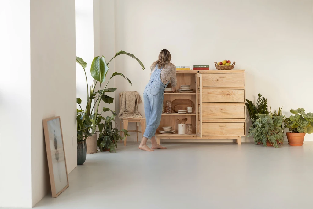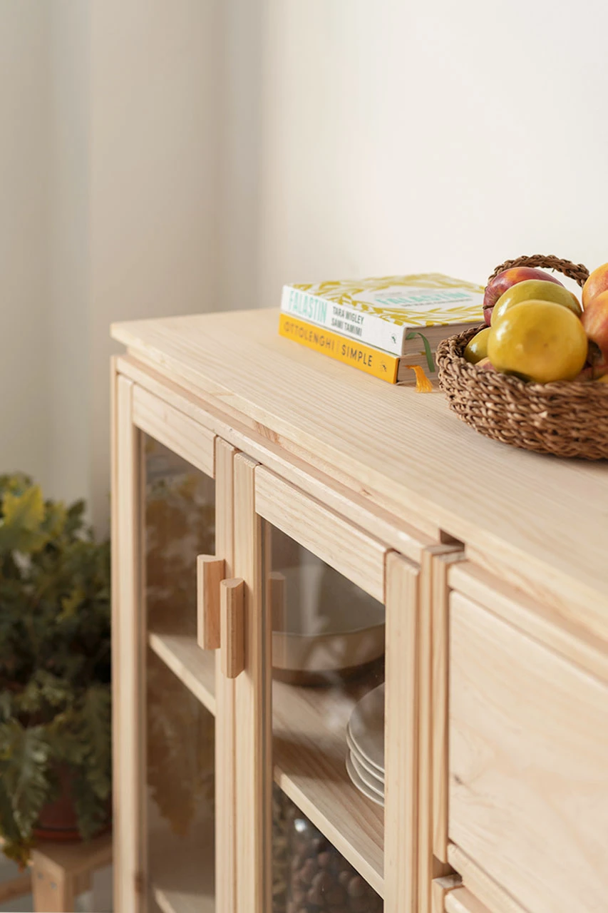 Vitrina de diseño con una cajonera integrada. Un mueble de almacenaje de madera maciza y natural, muy práctico para comedores, salones o cocinas.