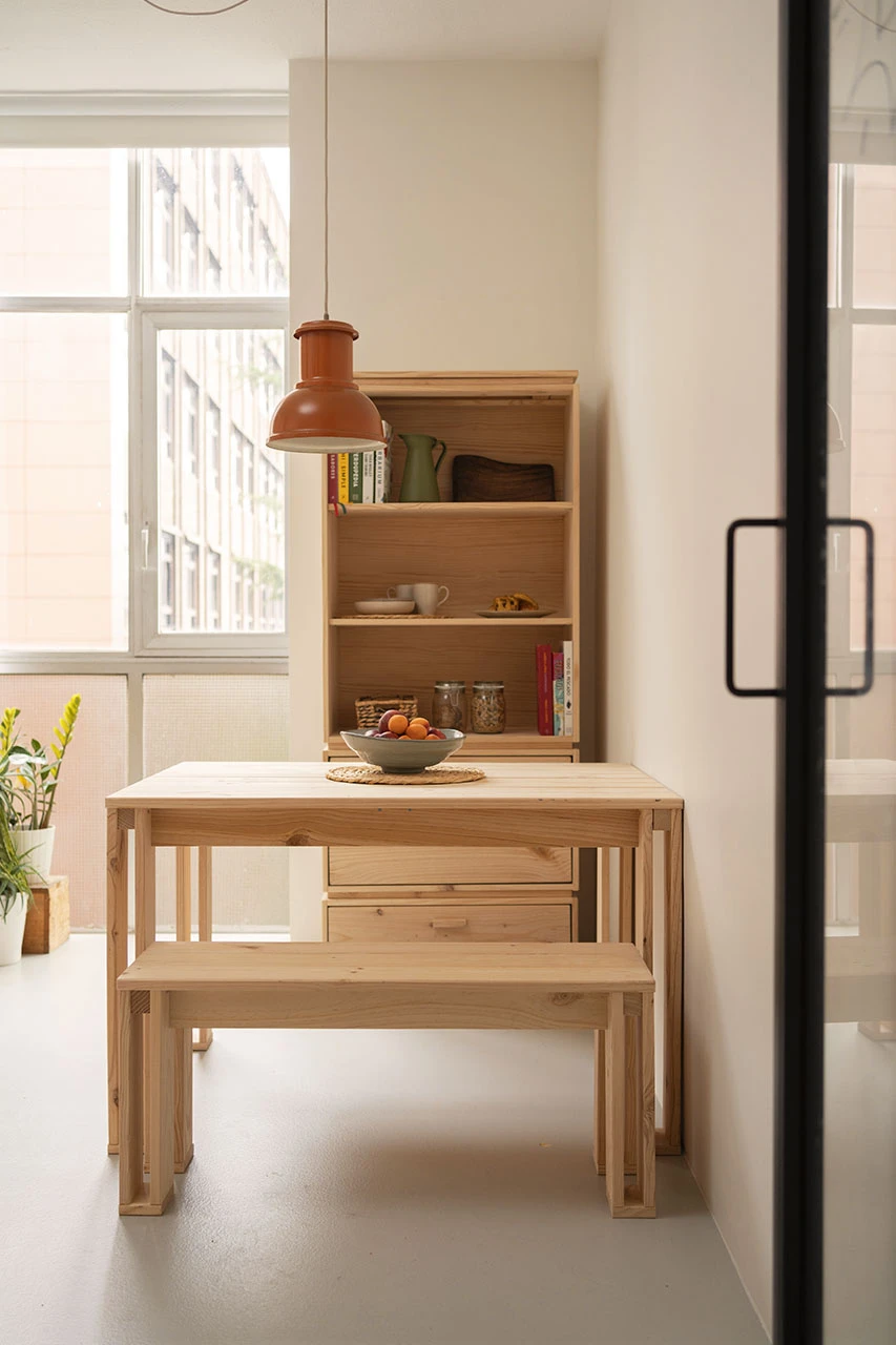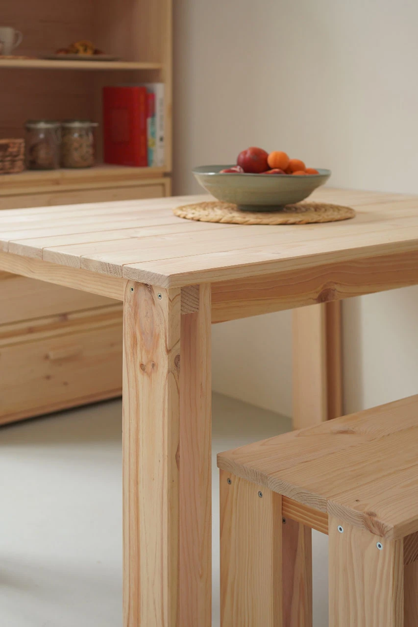 Mesa de comedor o cocina de madera maciza de pino. Ideal para cocinas o comedores pequeños. Una mesa para cuatro personas combinable con los bancos de madera ARINA.