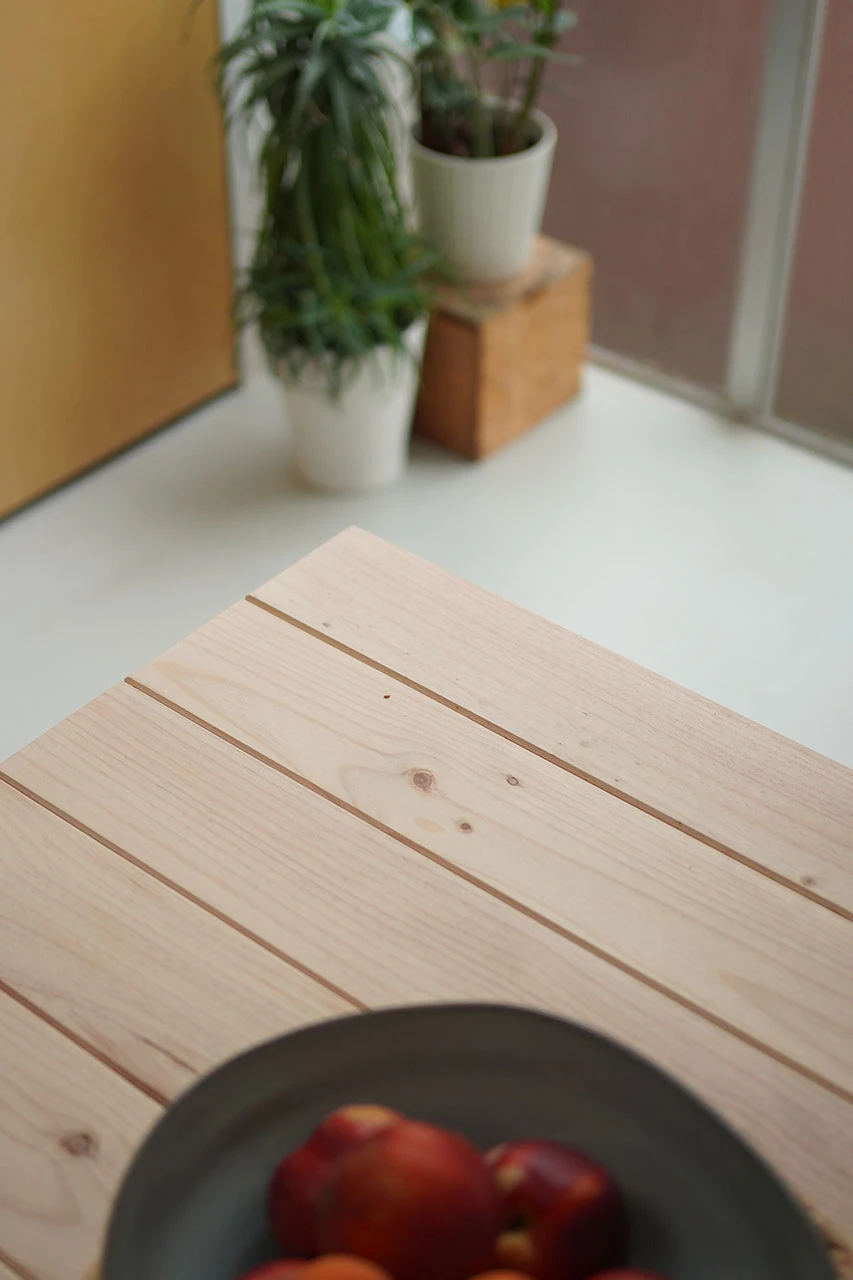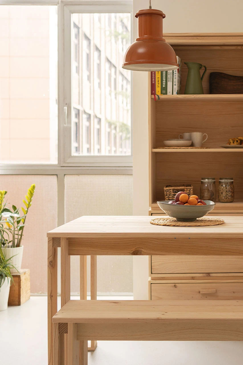 Madera natural, sin tintes ni barnices, lijada con máquina, lista para disfrutar al tacto y a la vista. Aunque como todas las maderas naturales, es un material con una superficie más delicada que las superficies sintéticas. Por eso conviene mimarla de vez en cuando.