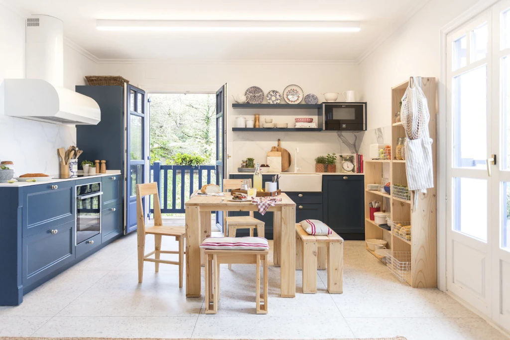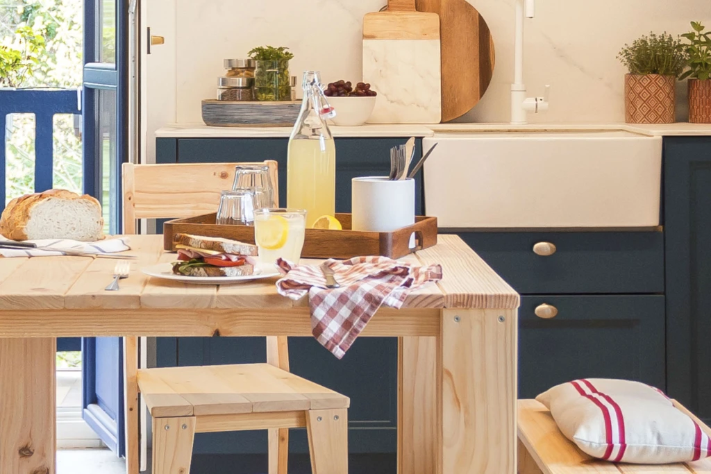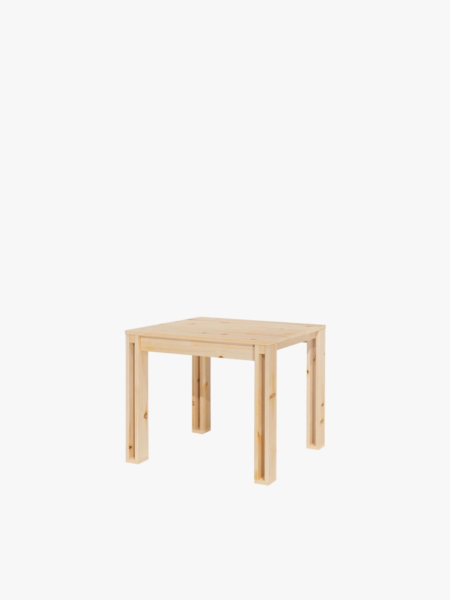 Mesa de comedor o cocina de madera maciza de pino. Ideal para cocinas o comedores pequeños. Una mesa para cuatro personas combinable con los bancos de madera ARINA.