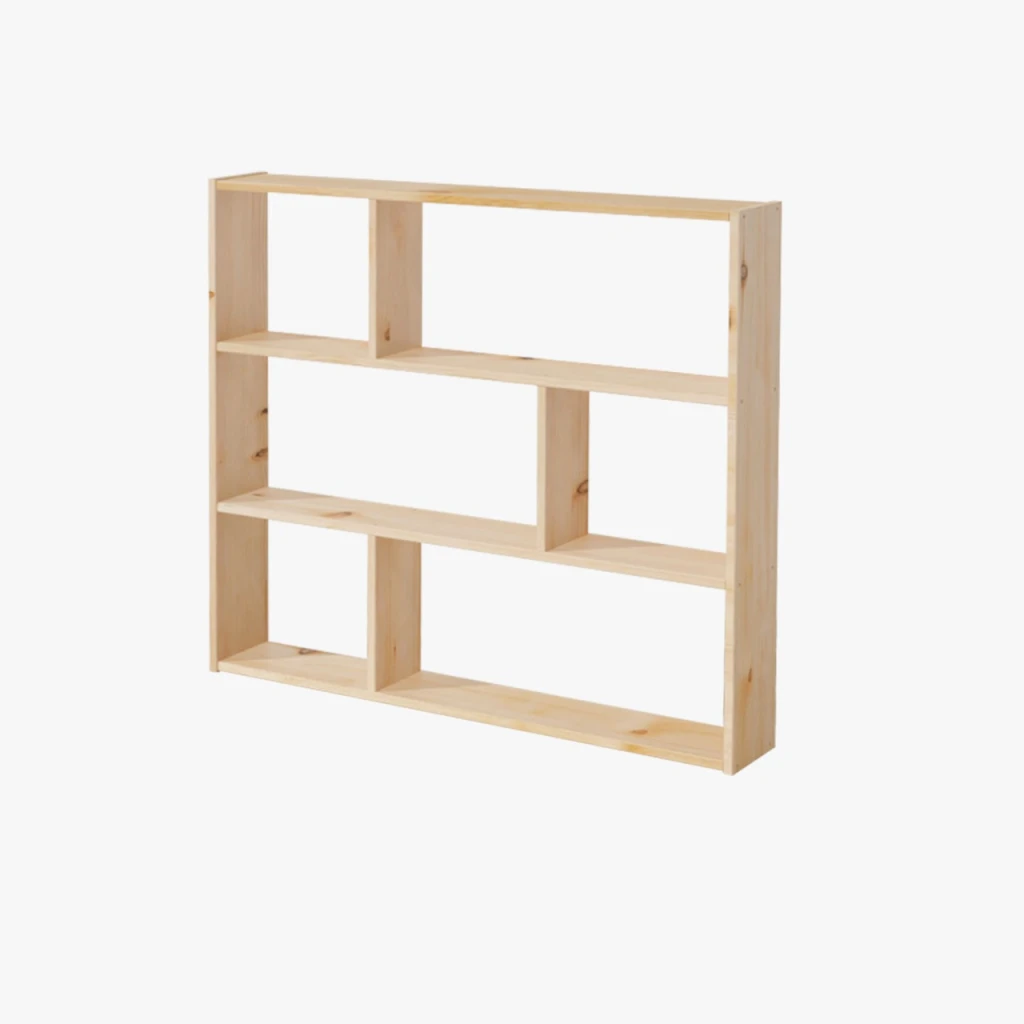 Estantería de madera natural con dos estantes para el almacenaje de libros y objetos decorativos. Una estantería asimétrica para pared o para apoyar en el suelo.