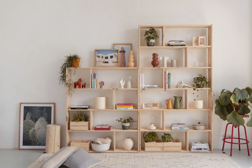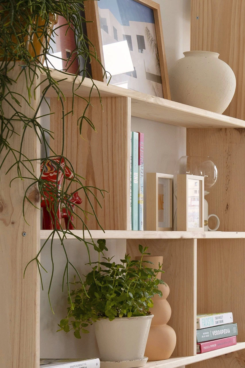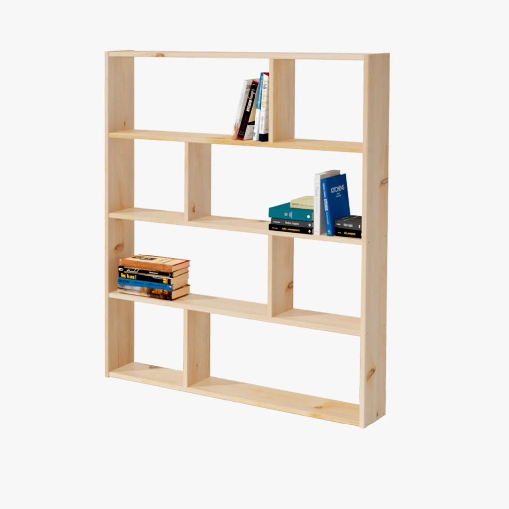 Estantería de madera natural con dos estantes para el almacenaje de libros y objetos decorativos. Una estantería asimétrica para pared o para apoyar en el suelo.