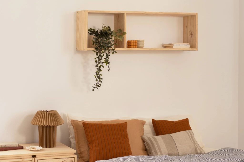 Estantería de madera natural con dos estantes para el almacenaje de libros y objetos decorativos. Una estantería asimétrica para pared o para apoyar en el suelo.
