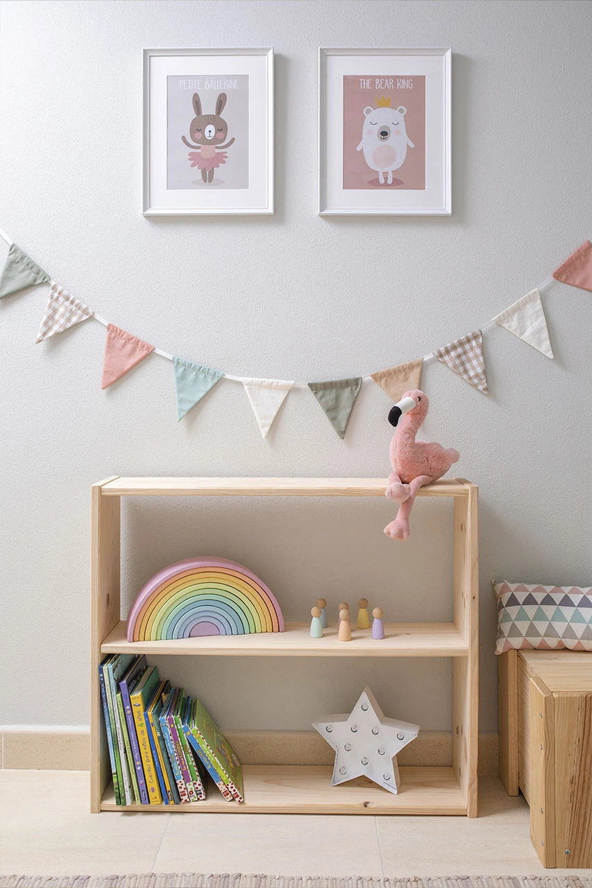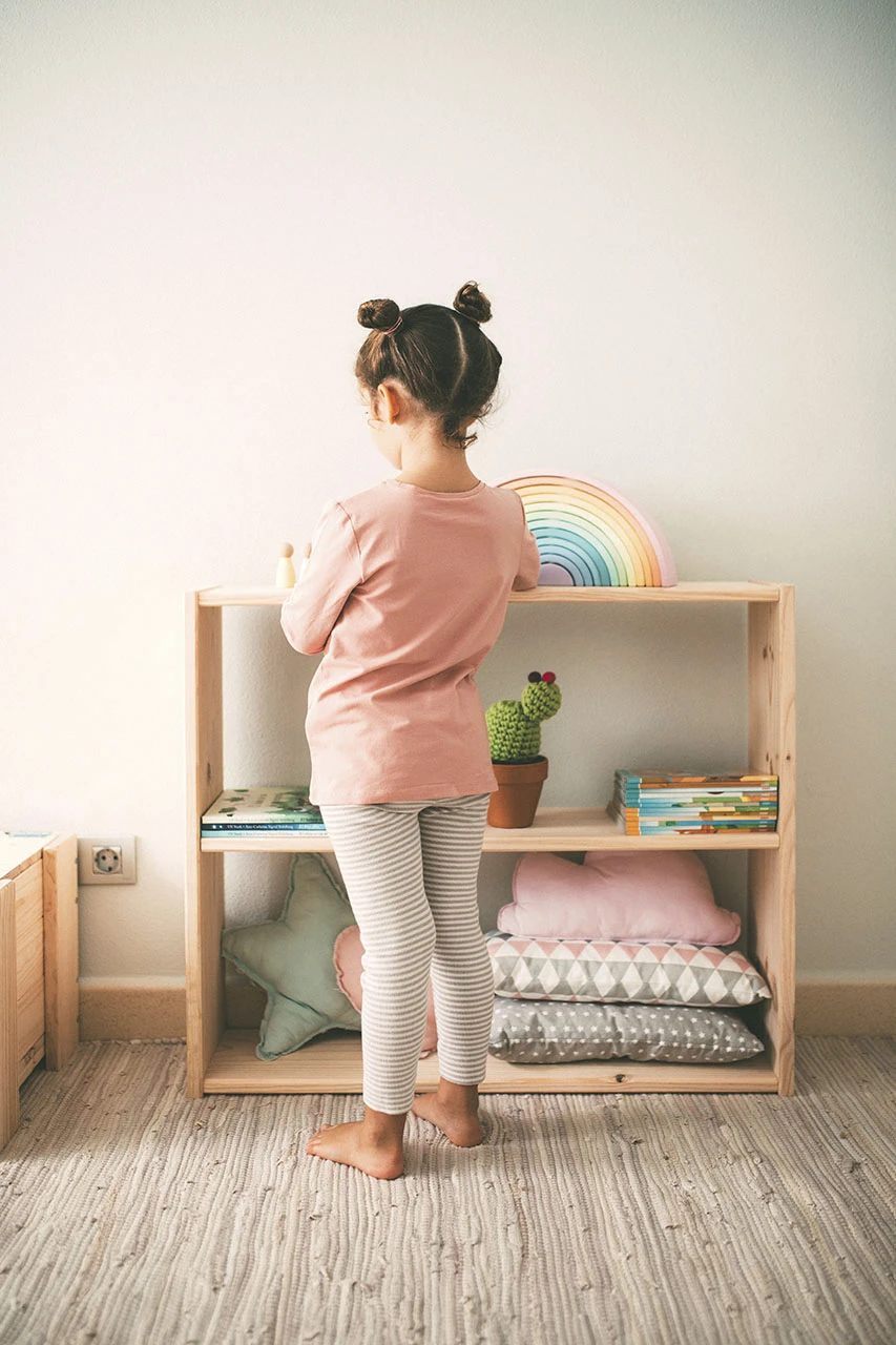 Estantería de madera natural con dos estantes para el almacenaje de libros y objetos decorativos.