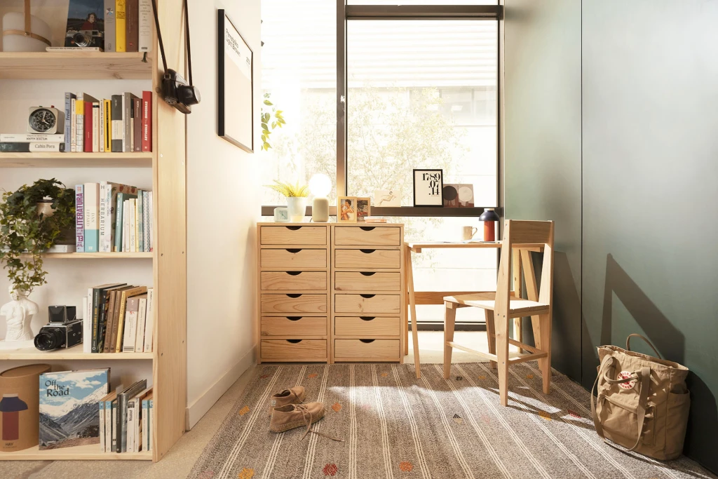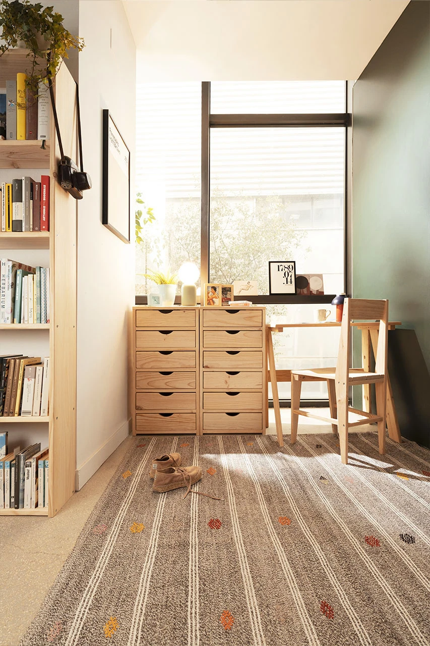 Madera natural, sin tintes ni barnices, lijada con máquina, lista para disfrutar al tacto y a la vista. Aunque como todas las maderas naturales, es un material con una superficie más delicada que las superficies sintéticas. Por eso conviene mimarla de vez en cuando.