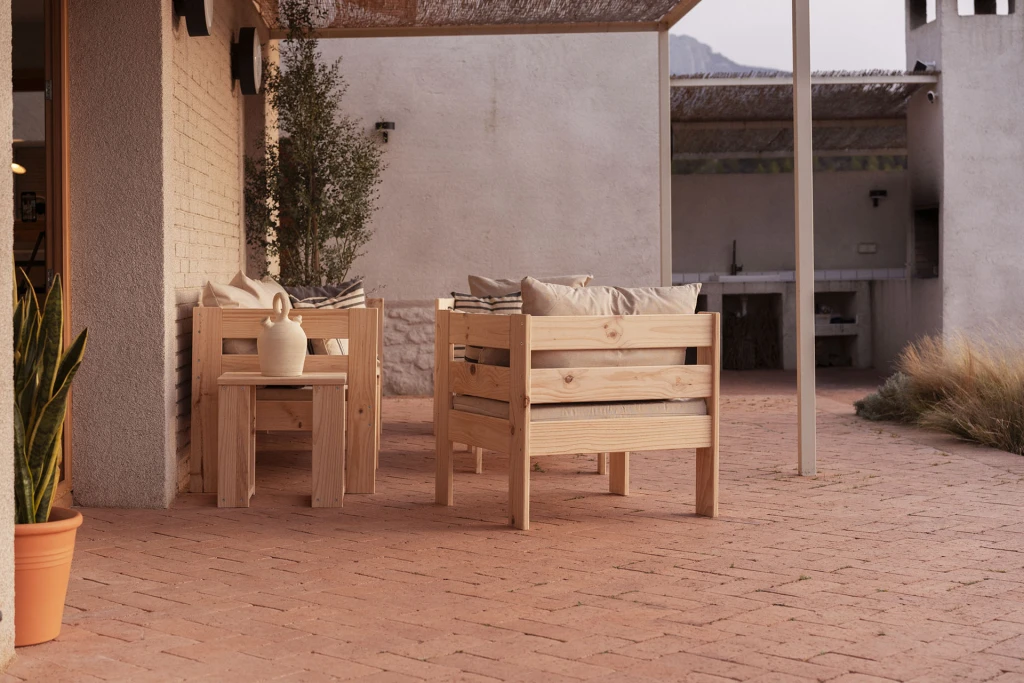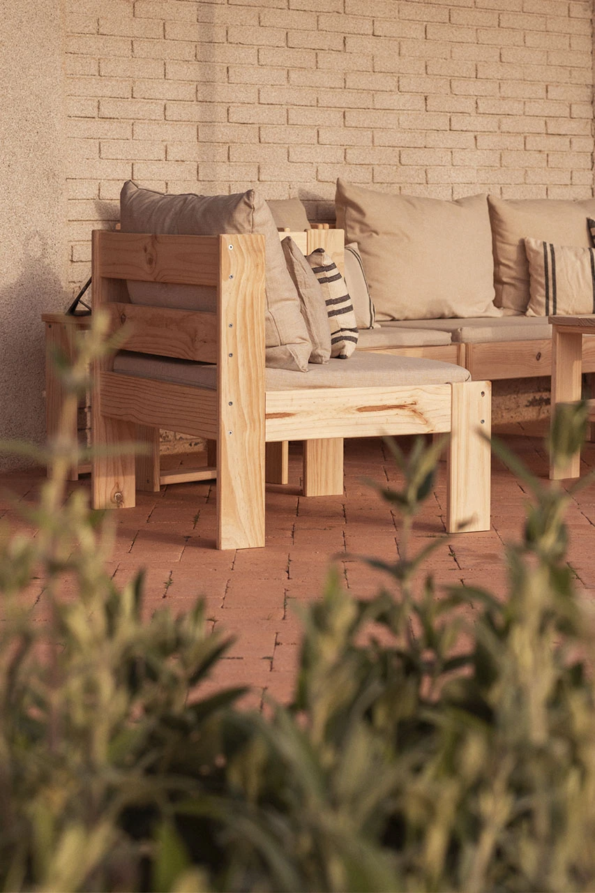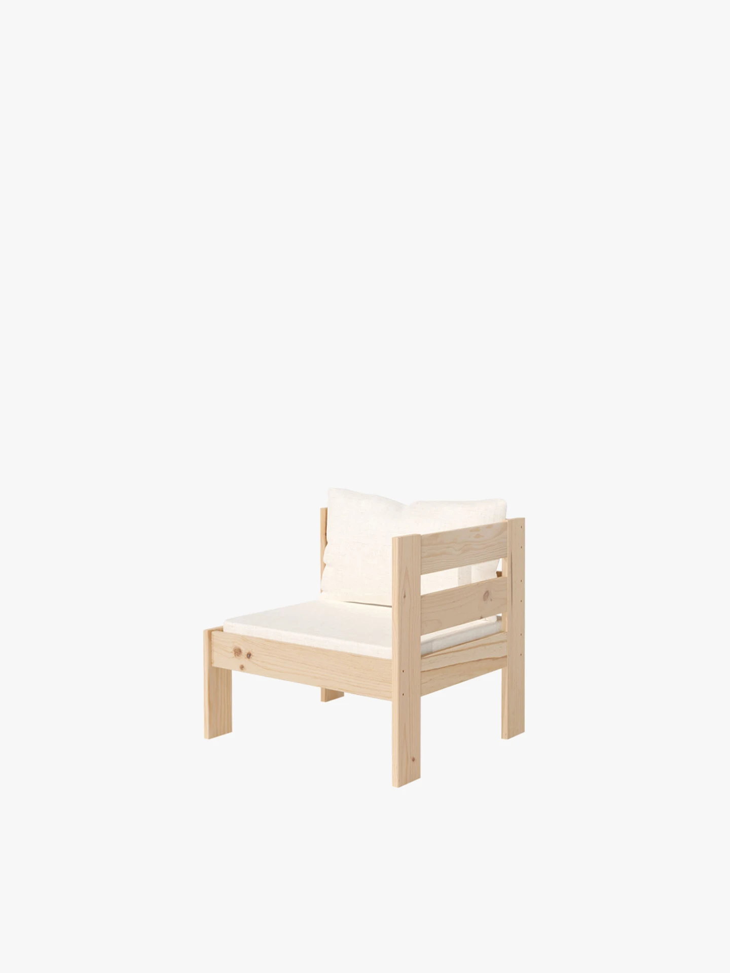 Sillón modular de madera natural con reposabrazo izquierdo. Un sillón de estilo nórdico para usar en el exterior de la casa. Incluye el cojín de base y el cojín respaldo, ambos disponibles en algodón blanco crudo o en olefin impermeable de tono beige jaspeado. Combinable con todos los sillones y puffs de la serie OREKA. Con diferentes tonos de barniz a elegir para proteger y personalizar la madera.