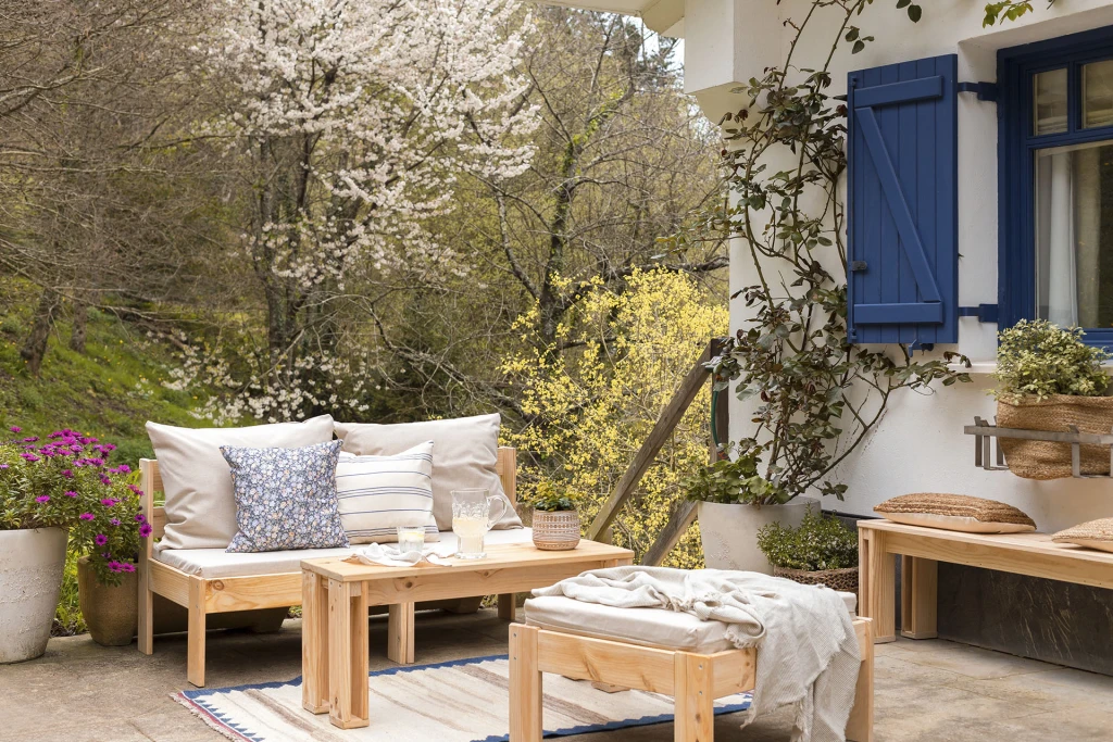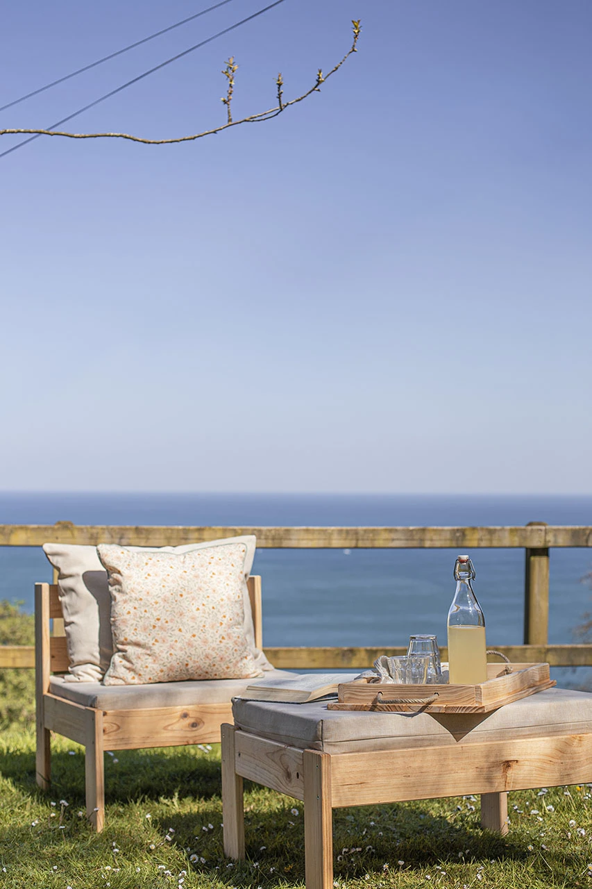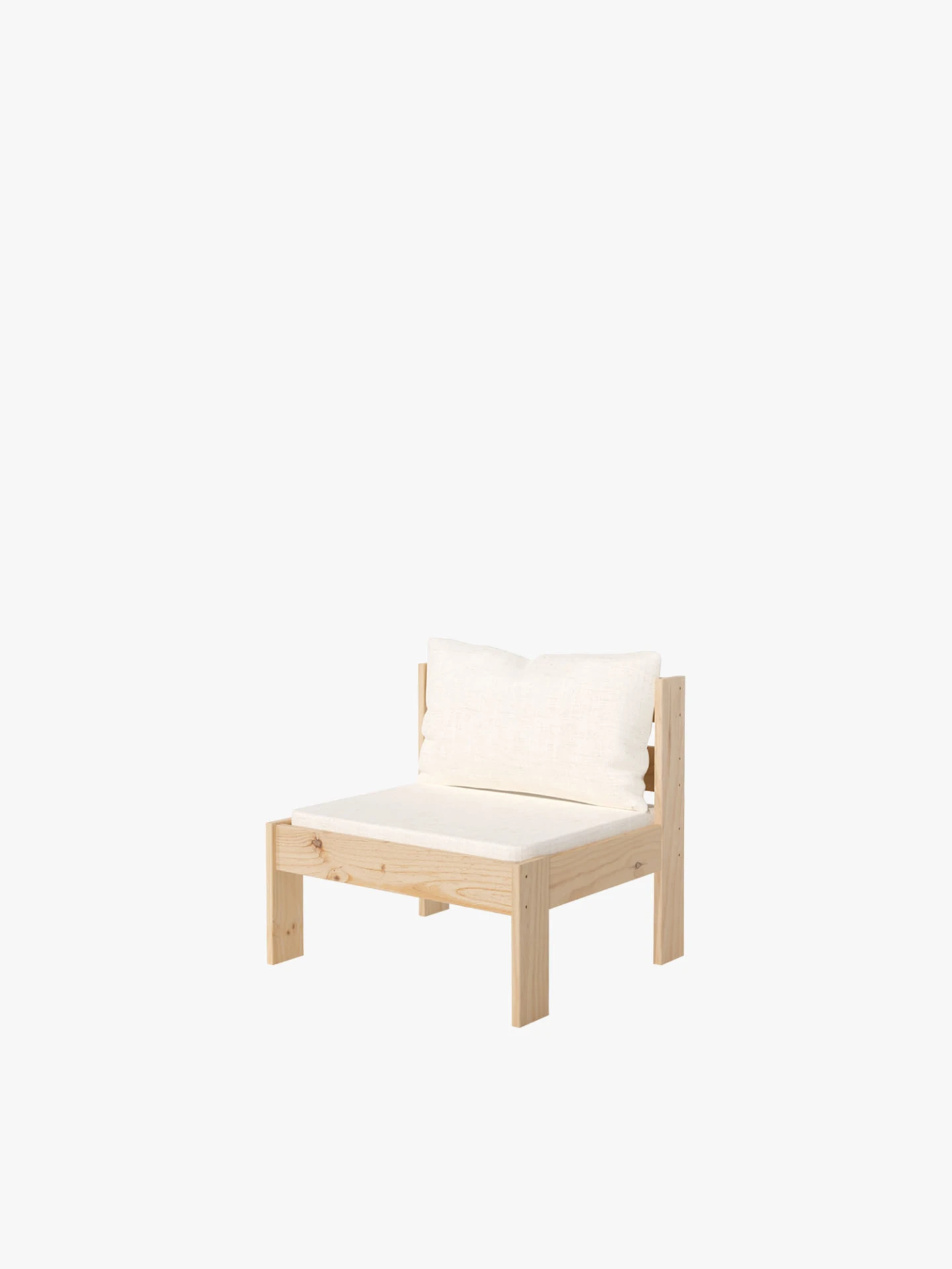 Sillón modular de madera maciza natural. Un sillón de estilo nórdico para usar en el exterior de la casa. Incluye el cojín de base y el cojín respaldo, ambos disponibles en algodón blanco crudo o en olefin impermeable de tono beige jaspeado. Combinable con todos los sillones y puffs de la serie OREKA. Con diferentes tonos de barniz a elegir para proteger y personalizar la madera.